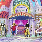 3. The Mermaid Cafe (One Piece) Luffy and crew visit the under-the-sea themed hostess cafe in in episode 529. The place is swimming with patrons thanks to its unique niche of serving sirens. It's similar to an Akihabara maid cafe, except with fishgirls and lots of seaweed-themed food.