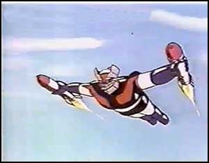 For me, Mazinger Z's greatest appeal lies in both its cast of heroes, featuring pilot Koji Kabuto, a boy that is at turns gallant and weirdly antagonistic to his buddies and would-be girlfriend, and in Nagai's typically nutty story ideas. My favorite piece of Mazinger Z plot progression involves the heroes making the sad discovery that Mazinger Z just isn't that effective against flying enemies. Dr. Yumi of the Super Science Institute eventually develops cool detatchable wings for Mazinger Z, but in the meantime, a variety of solutions are employed. The best one is when Sayaka, Koji's partner and flame, launches her girl robot's boob missiles(!), and then this happens: