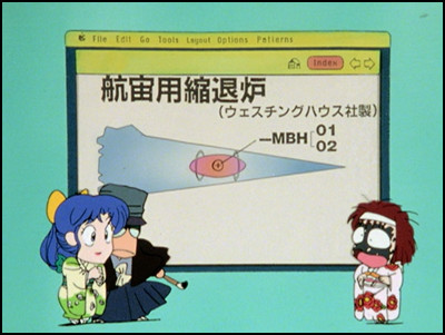 Gunbuster is bookended with short gag episodes called “science lessons,” which attempt to explain and contextualize the scientific concepts used in the series. These are hosted by chibi versions of Noriko and Kazumi, who dutifully guide the viewer through a Hypercard stack, which both dates the material and reminds the viewer how much Hypercard still looks kinda like a modern web browser. Interestingly, a couple of these episodes were newly-produced for a late-90s reissue of Gunbuster on laserdisc. Even more interestingly, one of them is the directorial debut of a rising talent named Kazuya Tsurumaki. Even more interesting still, Tsurumaki would eventually helm Aim for the Top 2: Diebuster, Gainax's 20th-anniversary sequel to Gunbuster.