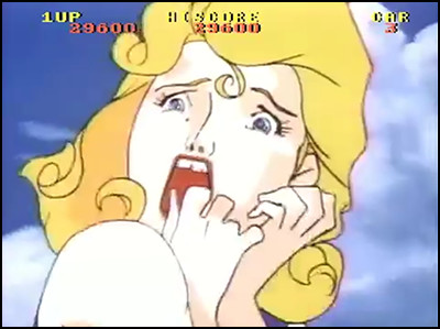 Taito's 1985 Time Gal is the crown jewel of this format. At first glance it appears to be a pretty brazen Dirty Pair ripoff, with main character Reika wearing a similar outfit and piloting similar-looking vehicles. Reika's a 30th-century time detective, traveling back in time to pursue Ruda, a sneering time villain. This game is beautifully animated, and Reika's fully voiced by Yuriko Yamamoto, who chirps and hollers her way through a boisterous performance. The game starts with a pitched escape from Godzilla, and it just gets sillier and sillier – one of Reika's “death” animations involves her losing her pants. Overall, Time Gal is brisk, funny, and always interesting to watch—it's a screamingly obvious pastiche of SF anime of its time, but it still feels like the most complete of the anime-styled LaserDisc games. It was so popular on its release that, for a little while, Reika became Taito's official mascot.