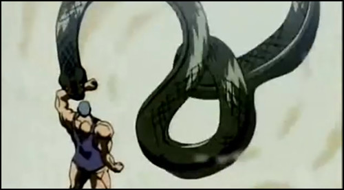 Interestingly, just as the Baki TV series was going into production, manga author Itakagki was wrapping up the main storyline's Maximum Tournament story… so he could plunge right into New Grappler Baki, in which our hero is set upon by a cadre of death row convicts. These homicidal maniacs have heard all about Tokugawa's underground tournament, they know that Baki won it by defeating a loose confederation of unbelievably dangerous grandmasters who are now his friends and trainers, and they know that Baki's insanely powerful dad is at the top of the pyramid. These bloodthirsty killers don't seek triumph, but instead hunger for someone, anyone, strong enough to defeat them! Oh, and they all look like this.