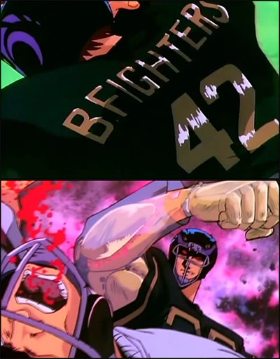 Other than those examples, the only glimpse of football in anime I can remember comes in 1993's 8th Man After OVA, which briefly depicts the gripping struggle between the Jokers and the Black Fighters. Wait a minute– Black Fighters?!