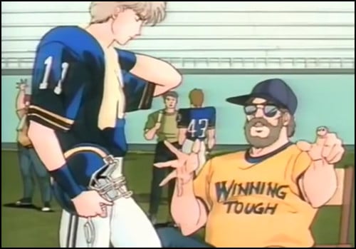 Beyond that, football in anime is mostly a series of odd little hints and glancing depictions. The 1976 TV series Gowapper 5 Godam clearly uses football uniforms as an inspiration for its heroes' outfits, but that's as far as it goes. 1977's Balatack starts with main character Yuji playing in a big football game, before becoming a standard super robot series. Football is used as window dressing in the 1989 direct-to-video featurette Cipher, which is one of the most unusual OVAs ever made—a mood piece, filled with American music, and executed entirely in English. Main character Shiva is a popular actor in New York, and he ends up starring in a football movie called Winning Tough, which appears to be directed by a weird amalgam of Stephen Spielberg and Stanley Kubrick. Amusingly, Shiva is played by Jay Kabira, who would later go on to sporting stardom of his own… as a soccer commentator. You might know Jay as the over-the-top narrator in the Mr. Tonegawa anime!