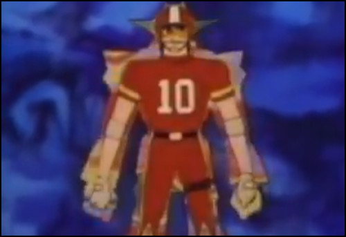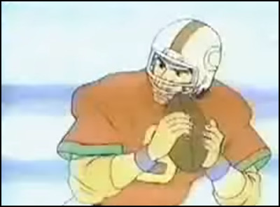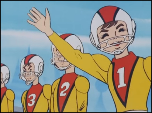 The first was arguably Charge Man Ken (Disclosure: I contributed to Discotek Media's release of Charge Man Ken on DVD.) One of Ken's better-known episodes, The Mysterious Handsome Boy, aired in April of 1974. Aside from the helmets, the outfits these children wear don't really resemble football pads, the animators struggle to communicate a competent rendering of the game of football, and the titular handsome young football star inevitably turns out to be a bloodthirsty alien in disguise, which Ken readily murders. Hey, I don't think that's a legal move in football!
