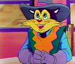 This isn't the only curiosity in Pero's trip to the NES. Around 1990, Captain N: The Game Master, Nintendo's notorious Saturday morning cartoon, would often dedicate an episode to a particular game. Most of these were high-profile titles like Bayou Billy or Donkey Kong, but the producers inexplicably chose to focus one on Puss 'n Boots. The episode finds Captain N and Link from The Legend of Zelda partnering up with Pero and chasing the game's final bosses across several different time periods. While those bosses, known here as Gruemon and Garigari (coming close to their Japanese names), look like their game and anime counterparts, Pero himself (right) got a noticeable redesign for Captain N.