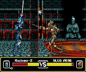 The well-handled brawling of Mazin Saga makes it all the more disappointing when the game reaches the end of a level and turns into a one-on-one fighter. For each stage's boss fight, Mazinger grows into a multi-story robot and takes on some Nagai-esque abomination in a clumsy, simplistic version of Street Fighter II. This part of the game feels like a tech demo; Mazinger's moves are limited to sword swipes, while the enemies show off more damaging weapons and actual projectiles. Each match is a tiresome fit of flailing and jumping, and it's enough to bring the game to a complete stop. Worse still, the developers clearly thought that these were the best parts of the game, perhaps because of the massively jointed characters, and they decided to repeat all of the boss fights towards the end of Mazin Saga. If that's not enough, there's even a code to reduce the entire game to these boring boss battles.