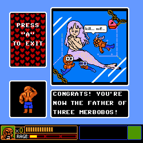 It's technically about the big guy from Double Dragon, but it's really about the entire culture that Nintendo built with its 8-bit game console in the late 1980s. Abobo swims through an underwater Super Mario Bros. stage, scours a Zelda dungeon, fights through the toughest Mega Man 2 level, and discovers countless pieces of NES history. It mixes original sprites with graphics straight from the games, creating something that probably isn't covered under fair use laws. But that's OK, because it's all in good fun. Well, most of it is. Some of it relies on the empty, violent humor that fills too many Newgrounds creations. For example, the water level brings Abobo face to face with the mermaid from The Goonies II, and his options are as follows: Eat, Hit, Mate, and Vomit. Only one of those choices brings remotely funny results.