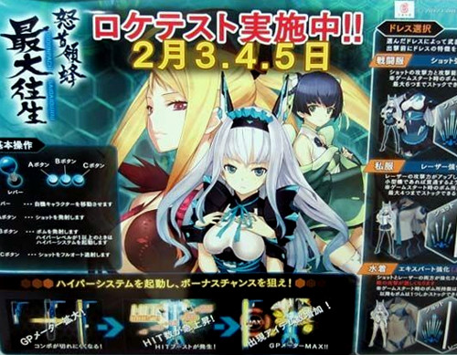 The other Dodonpachi is Saidaioujou, and it was recently on location test in Japanese arcades. The scoring system's still under dissection, but details emerged about the game's...shall we say...unique modes. Dodonpachi Saidaioujou features at least three women pilots designed by Ar Tonelico artist Nagi Ryou, and they change their outfits depending on the player's chosen weapon system. Pick a setting that emphasizes the basic wide-range shot, and they'll wear combat outfits (which are apparently maid-like getups). Pick a powerful laser and fewer bombs, and they'll wear their casual clothes. Pick the toughest difficulty level, with lethal standard fire and only one bomb, and they'll wear bikinis. By this logic, the game should have a novice-player mode where all of the characters wear full medieval armor or clanking Victorian diving suits, but I doubt Cave will consider that.