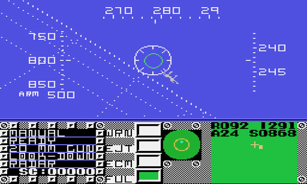 The graphics are another bold choice. While the player is initially filled with excitement with an appealing title-screen, the display of the game itself is surprisingly featureless. Instead of attempting to give a sensation of flying, the creators opted to make the display primarily numbers. This inspires a strong sense of ennui. Instead of going on a thrilling adventure, the player is treated to a monotonous grind. This emulates the sensation of battle-fatigue; killing isn't fun, it isn't even interesting, it is mundane as all sense of one's humanity is torn away. The sound further contributes to the sense of banality: instead of music, F-16 Fighting Falcon has a loud buzzing white-noise soundtrack. It never goes away, echoing the message that war is never something to be enjoyed. It carries on eternally, grinding on the psyche of soldiers and nations that engage in it.