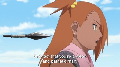 It's so baaaaaad. There's one redeeming line in it though. See, after the Evil Bad Thing has taken him over, Stalker Kid tries to take out all the girl's friends so he can kidnap her. Boruto gets pinned down and can't stop him, so Cho-Cho steps up and basically tell him "You're a pathetic creep, that's why nobody wants to notice you."