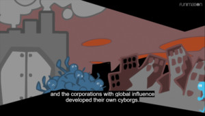 Really though, the reverse Wall-E concept works wonders for personifying the idea of cold, empathy-devoid corporatism. The cyborgs, while being human in consciousness, are reduced to, well, Gears in the machine. They exist to fulfill The System's vision of order and failure or refusal of that leads to being scrapped and replaced with somebody who will earn the fuel they require.