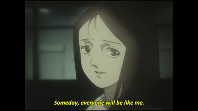 Manaka winds up being central to many of this show's threads, and once the other shoe drops you start recognizing just how far-reaching her presence was. The show is even nice enough to continue its call-backs to early episodes so you can remember that yes, even that weird thing was partially painted by this poor girl. I dunno, maybe I'm weird but the idea that Manaka is actually a representation of the next step for humanity's evolution that tragically came about too soon was both perfectly sensible and also emotionally resonant. Poor girl had it rough, she didn't choose to be what she was—and the world certainly didn't know what to do with her. And then she's cursed with echoing the last phrase she heard. She's the central locus of human knowledge, and even if she had the will to take advantage of it she couldn't.
