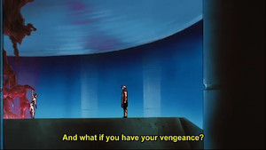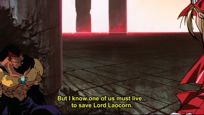 Andy and Mai's defeat leads to yet another tie-in to the game's story. We see Panni sneaking up on Laurence Blood, servant to Krauser from Fatal Fury 2. Blood is still reeling from his master's death, while Panni notes that Krauser's chestplate was part of Mars's set. Again: nice way of tying the game's lore into the movie, even if Blood ultimately doesn't have any greater significance to the movie.