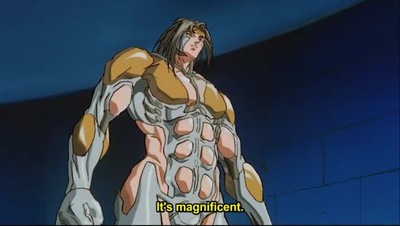 I don't like the phrase "equal opportunity fanservice", because it often just means "Yeah, women like guys who are built like gorillas, right?" But Obari's brain is in another dimension, so men also wear outfits that are equally as skimpy as the women. Only Obari would be willing to dress men like the female cast of Agent Aika, which he would soon use to full extent in Gowkaizer.