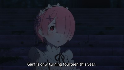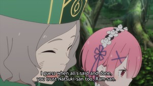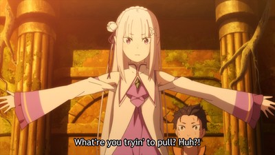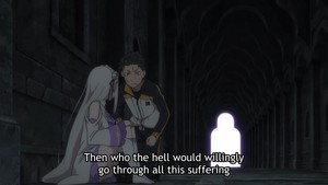Honestly, it was the most shocking revelation this season even after we go through all the stuff with Emilia. Speaking of: Subaru finds Emilia practically at her lowest and tries to give her a pep-talk, and while she's still upset at how he "broke his promise" by sneaking away into the night, she also subsequently starts revealing a bit of what might actually be bothering her.