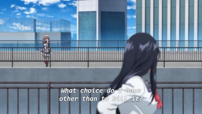 I'm gonna have to agree. Ten years ago, when stuff like Gantz was more popular, I shied away because that just isn't my bag. That, and it was annoying to deal with folks who insisted that Gantz was totally smart, maaaaaaan. Considering how much lower the bar has sunk in the years since, yeah, this is the kind of garbage fire I'm willing to put up with. Again: if you have to make me sit through this kind of show, High-Rise Invasion did a good job of incentivizing me.