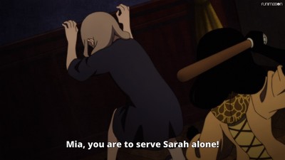That's our first clue that we can't take any of the rules of Shadows House at its word. Clearly there's more going on here. And the issue of punishment is also an important one, because while Sarah up there acts flawlessly as her mistress Mia's face in public, in private their relationship is flat-out abusive. Sarah trashes Mia's room with soot when she is out, and beats her doll for any infractions.