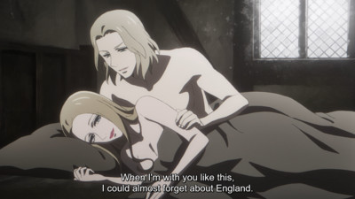 So, to break down more comprehensively: after Old Dick had successfully rebelled against the Lancasters he was soon killed in the battle of Wakefield, putting his eldest son Edward IV on the seat over the previous Henry VI. Kanno portrays Edward as noble but also amorous. Making him easily manipulated after he becomes infatuated with a woman of lower status, Elizabeth Woodville, who seeks to seduce him as revenge for the death of her husband, John Grey. Young Richard had killed Grey in a mad escape to see his beloved father, only to discover his dad's head. Richard then later spies on his brother Edward's affair during a hunting trip and is threatened to help keep it a secret. Warwick had set up for Eddie to marry the King of France's daughter but he rebuffs both him and France for Liz. Nobody is happy!