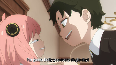 Anyway, with Anya in Eden College, there are further complications: Anya and the Forgers need to be invited to a fancy soiree in order to get close to Twilight's target. The only way for that to happen is for Anya to become an extremely-decorated student and earn eight merits called Stella Stars. Twilight knowing that Anya isn't that good of a student, his alternative is for Anya to become friends with Damien, his target's son and Anya's classmate. And, uh... that ain't happening, suffice to say.