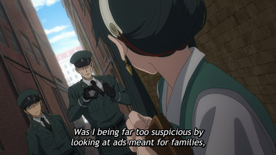 The castle escapade is a good example of that. They really elaborate on the joke and make it feel like a much bigger ordeal. Similarly, a lot of the settings feel gussied up. The Forger's family apartment feels like it came straight out of a designer magazine. The school lives up to its reputation. The city streets feel clean and modern, while still being fairly accurate to the time period. And of course, not to mention WIT's wonderful sakuga.
