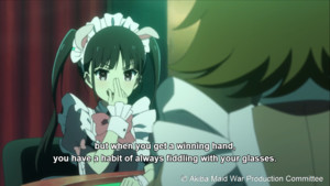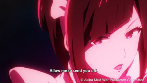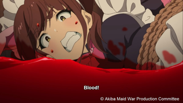 Staying on brand is an important part of a maid's job! It's a detail driven home in one of the later episodes, so I'm not surprised to see that so many of these girls can't turn off their marketable vocal tics even when they're using their last gasps to hurl grenades at their attackers.