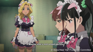 Akiba Maid War has plenty of in-between characters for the discerning Masters and Mistresses patronizing the café. Such as Zoya, the MMAid who trades blows with Ranko in the third episode, her face having been obscured in the OP up to this point in an attempt to hide the fact that she'd be joining the crew by the end.
