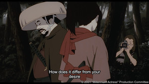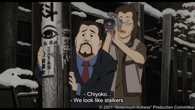 Well, good human stories are indeed eternal. As an animated film, the characters in Kon's film might only be drawings. Still, they've always been animated in a way emphasizing both realism and expression, making them feel more real than any flesh-and-blood actor could capture. These two bystanders, a Television interviewer and his cameraman on a mission to shoot a documentary about a now-bankrupt landmark movie studio and its once-star actress, serve as the framing of which we view the life and career of Chiyoko Fujiwara.
