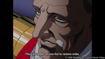 It's also playing into some samurai tropes with the implication that Hasegawa is a bit of a feudal lord, as in previous times as cities and populations grew, so did the amount of crime. Using ex-cons for labor became a practice. Some of the names have a historical theme, and the big man looks rather imperial. It sounds strange for your futuristic setting, but it's not, given this is the same dude that made Ninja Scroll. Plus, it's a neat comparison of periods of growth throughout history. While bringing in greater goods increased the quality of life, like stability and convenience provided by technology, it can also lead to greater evils.
