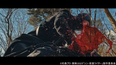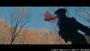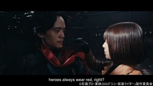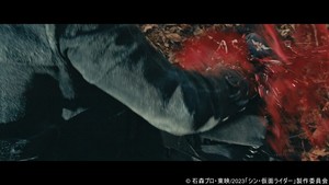 Kamen Rider could feature the right amount of red stuff, so it still fits Anno's indulgence in homage. And hey, it's purposeful, too, in how it sets up Hongo's aversion to violence and his new superpowered bod's capacity for it.