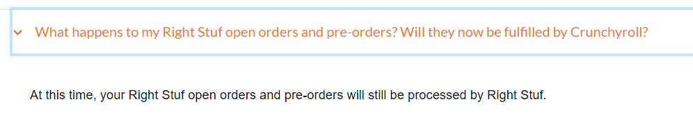 That's also why proper messaging and precise, direct announcements would have made this announcement less tumultuous. Pouring over any official information—especially the Crunchyroll store's FAQ—suggests that this is not, for the time being, a shuttering of the actual business that constitutes RightStuf. As far as I can tell, it is consolidating everything under the CR online storefront. That's speculation that I'm confident on, but still, speculation because even a question as simple as "What about my pre-orders?" has a nebulous, non-committal answer.