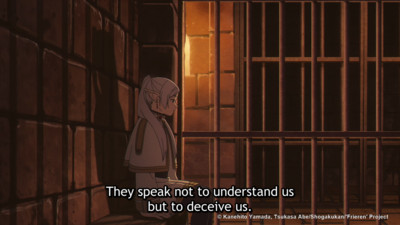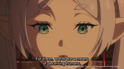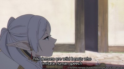 Frieren speaks like they're not even sentient. She compares their mastery of human language to the kind of mimicry predators sometimes evolve with to lure in their prey.