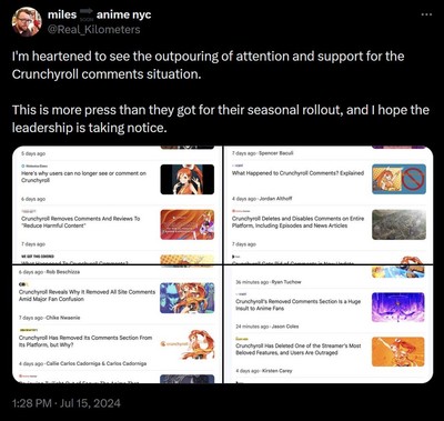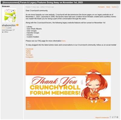 Crunchyroll had already axed their forums back in 2022, so it's not like this current deletion went against the grain of their current ethos. Since their acquisition by